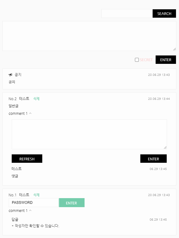 비회원 비밀글 작성/댓글 확인 가능하고요, 회원 비밀글을 작성자가 확인할 때에 패스워드를 한 번 더 치지 않아도 됩니다.
