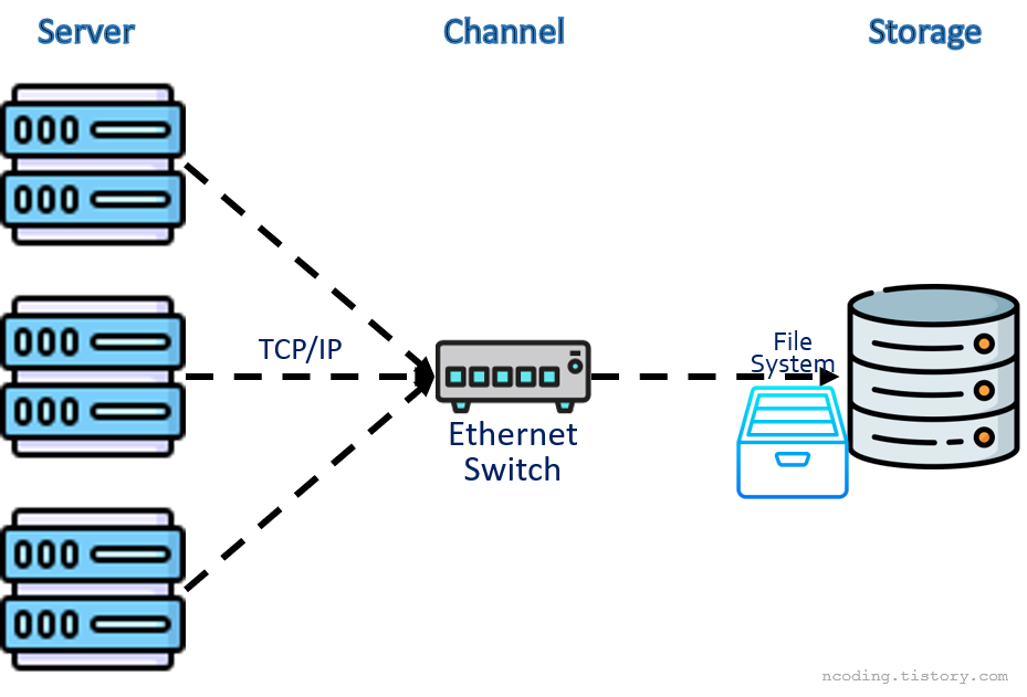 나스는 L2나 L3같은 네트워크 스위치를 통해 TCP/IP를 사용하는 이더넷으로 통신한다. 사용자는 NAS로 등록된 IP를 통해 NAS에 접근 가능하다. 물론 ACL(Access Control List) 설정도 가능하다. 윈도우는 보통 AD를 연동하여 권한을 주고, 리눅스는 ip base기 때문에 ip 화이트리스트를 만드는 식이다.