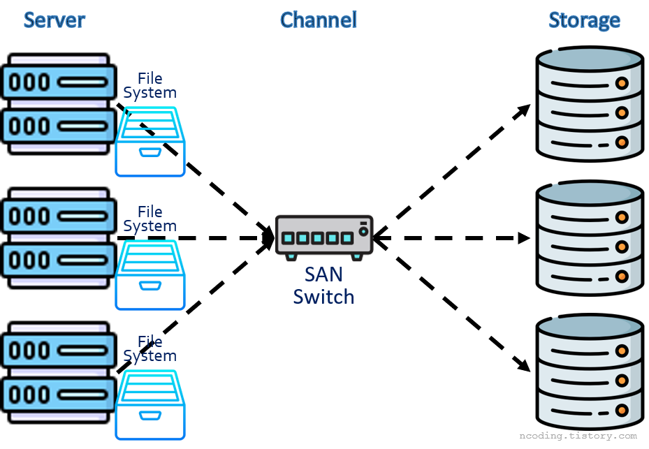샌 방식은 다스 구조에 SAN Switch를 달아서 여러 스토리지에 여러 서버를 연결할 수 있게 했다. 각각 다른 OS 환경에서 스토리지 자원을 나눠 가질 수 있게 된 것이다. SAN Switch를 통해 스토리지 전용 네트워크가 만들어지기 때문에 Storage Area Network라고 칭한다.