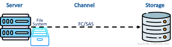여러 대의 서버에서 하나의 스토리지를 동시 사용하고 싶다면, 서버를 클러스터로 구성하거나 별도의 Application을 사용하거나, 후술할 NAS 방식으로 연결하여 사용하면 된다.