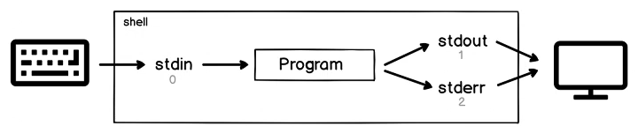 | STDERR | 2> | 2>> | 표준 에러 출력을 터미널이 아닌 파일로 출력 |
