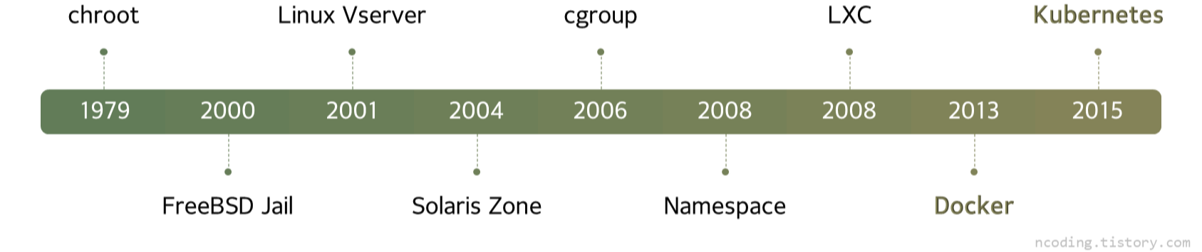 FreeBSD의 Jail은 파일시스템과 프로세스, 네트워크까지 분리하였다. 컨테이너의 시작이라고 볼 수 있다. Jail의 뜻을 생각해 보면 이해하기 쉬운데, 감옥은 간수가 관리하지만 하나의 방 안은 독립된 공간으로 죄수가 사용한다. 리눅스에서도 Vserver, 리눅스 격리 환경을 구현해 내었다. OS 가상화라고 볼 수 있다. 비슷하게 솔라리스에서는 Zone 기술을 발표하였는데, 솔라리스 9에서 솔라리스 8을 가상 OS로 사용하는 것이다.