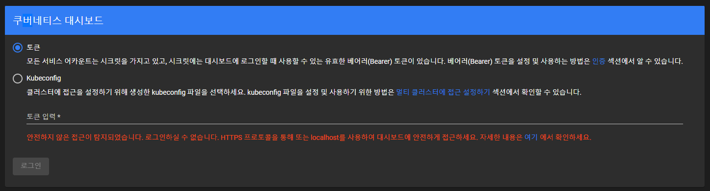 해당 과정을 거치지 않고 원격지에서 마스터 노드 IP를 통해 대시보드에 접속하면 보안 문제로 토큰 입력이 불가능하다.